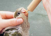 * 用鸟儿专用注射器给饥饿的婴儿鸟喂食
